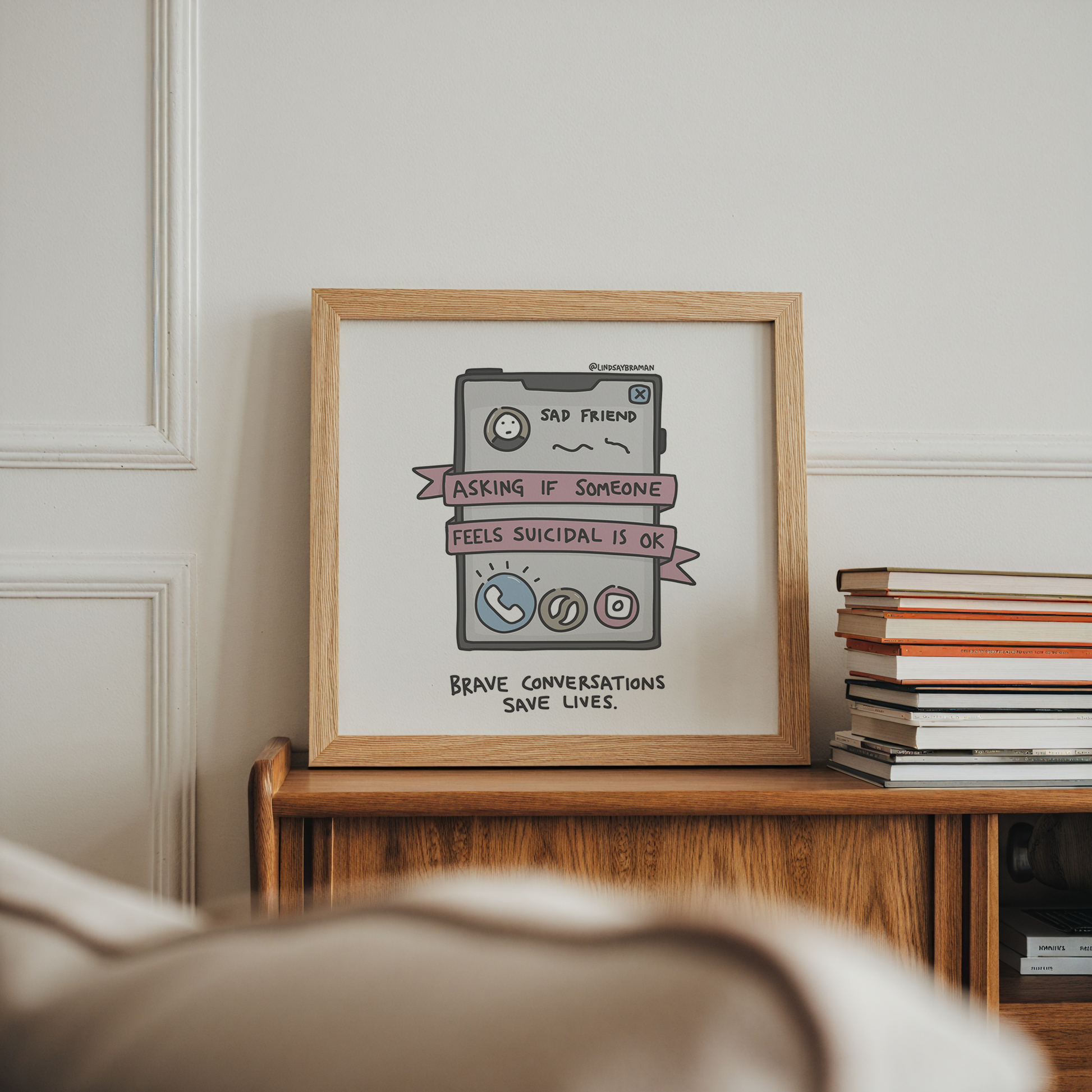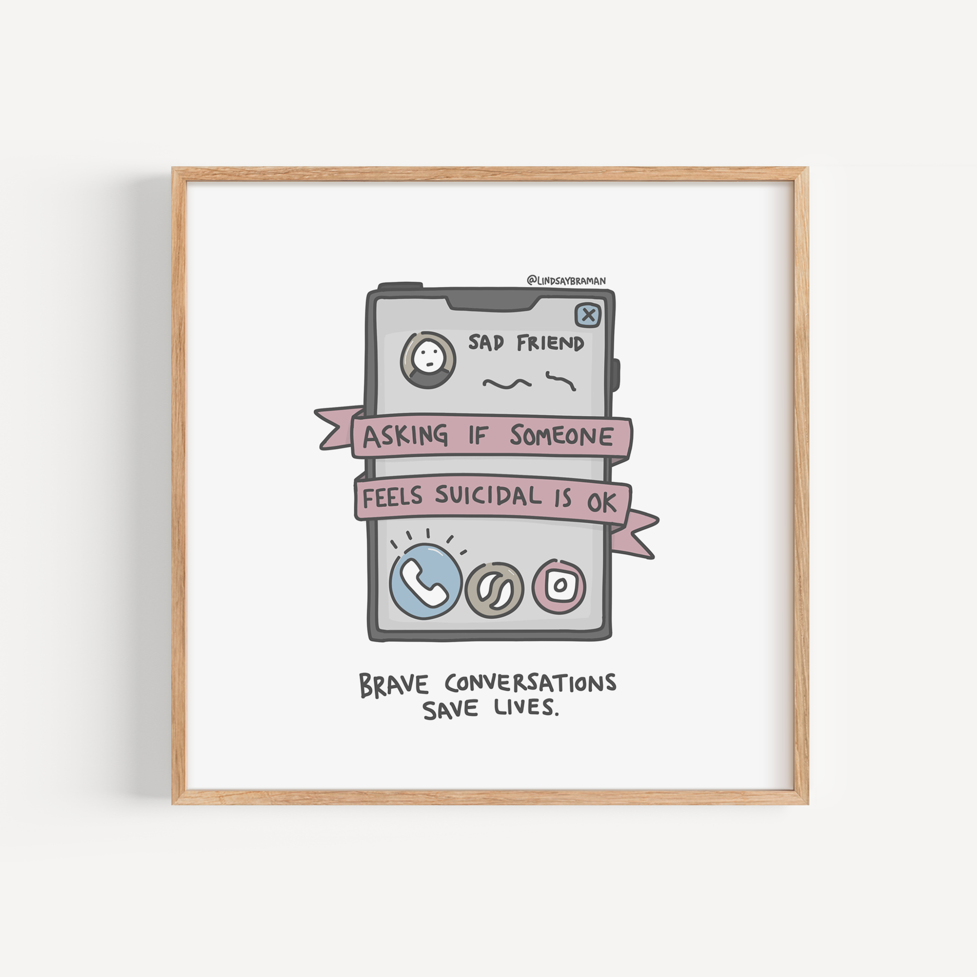 About this Artwork: This illustration is a visual reminder that asking if someone is suicidal won’t give them ideas, but it may help them feel less alone.
