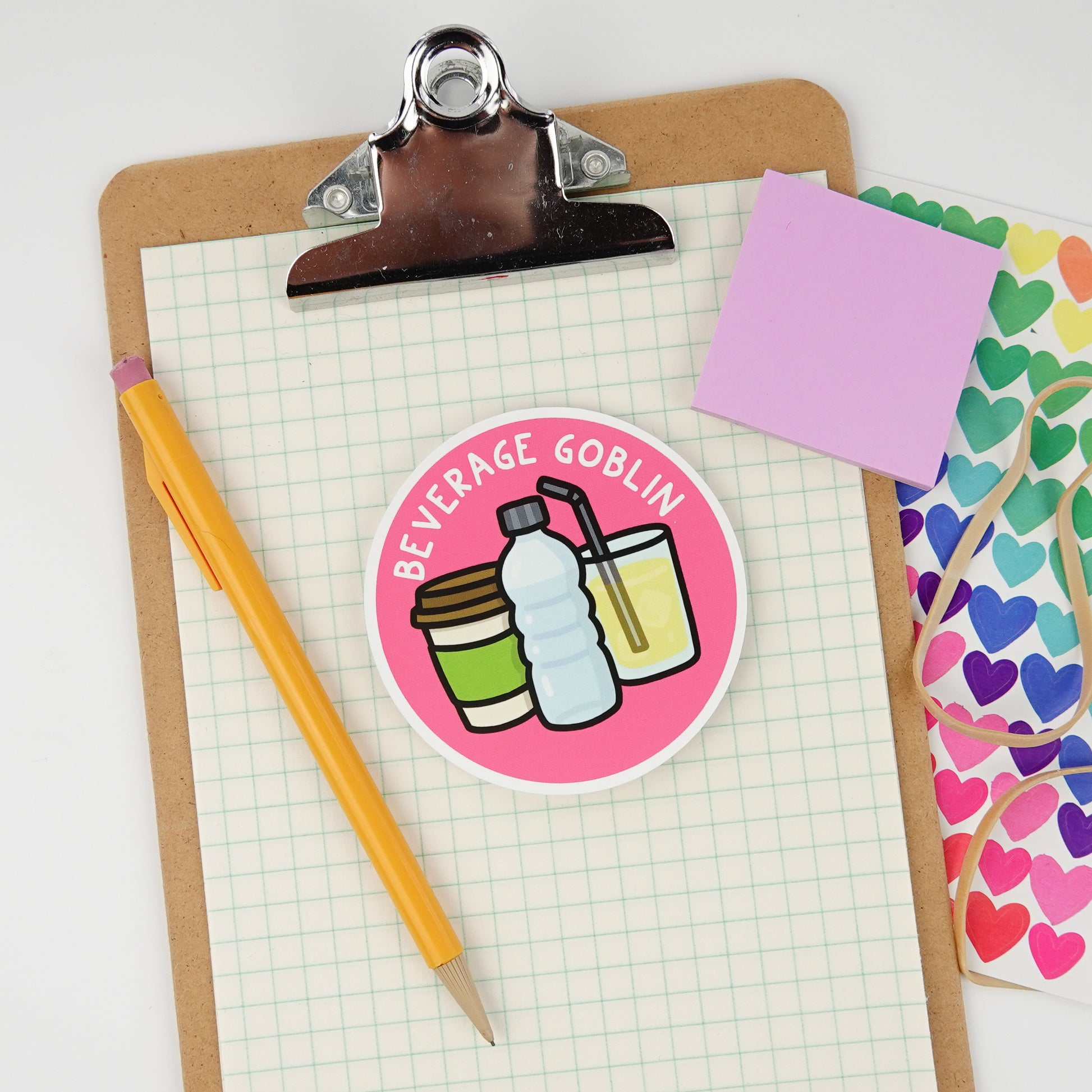Beverage Goblin is for anyone whose desk always has at least three drinks going. Hydration? Coffee? Emotional support soda? This 3" x 3" vinyl sticker embraces it all.
