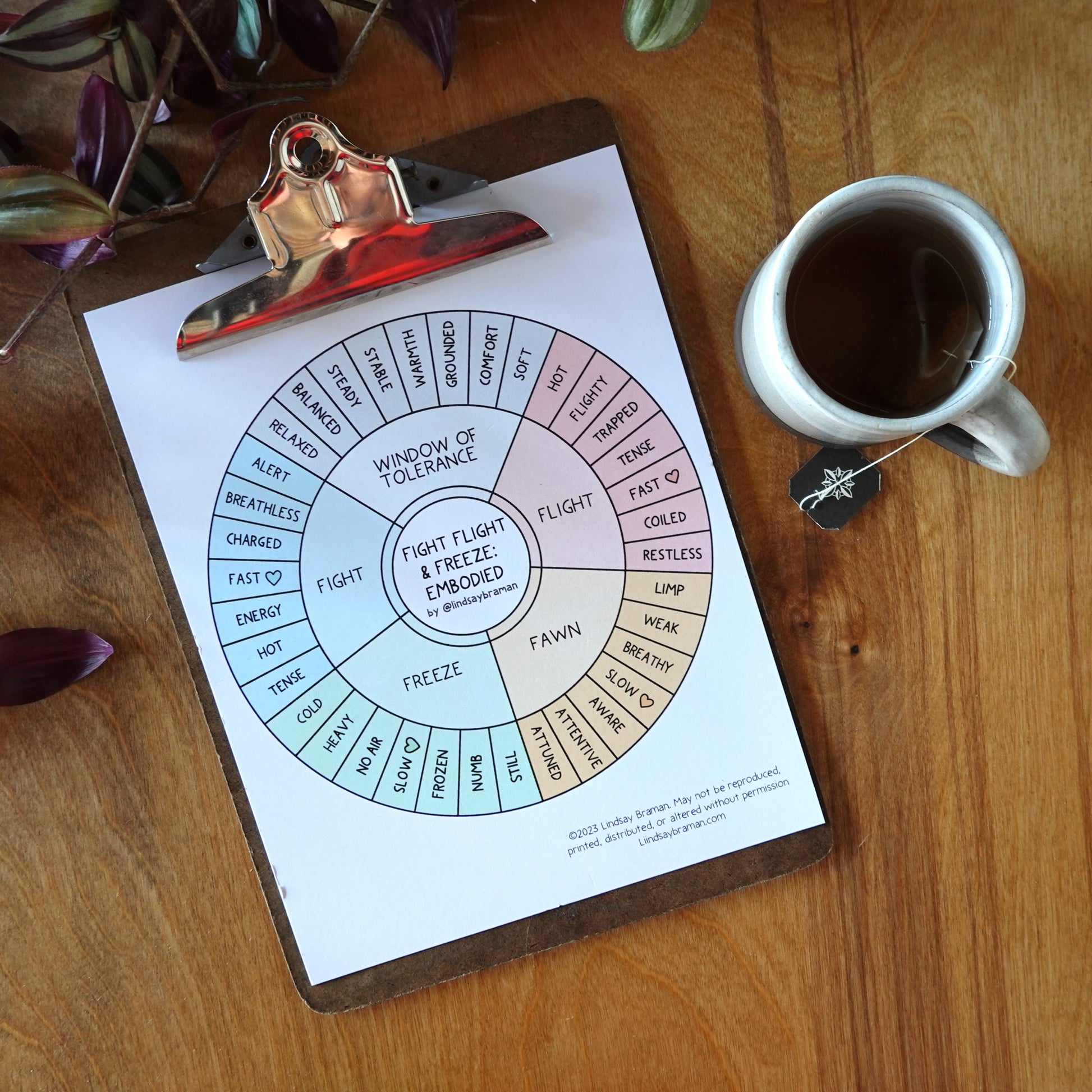 Learn More: For more information on this topic, read the article: Fight, Flight, & Freeze Embodied Wheel - A Resource for Growing Window of Tolerance. This product is available as a free pdf for Lindsay’s Patreon members.