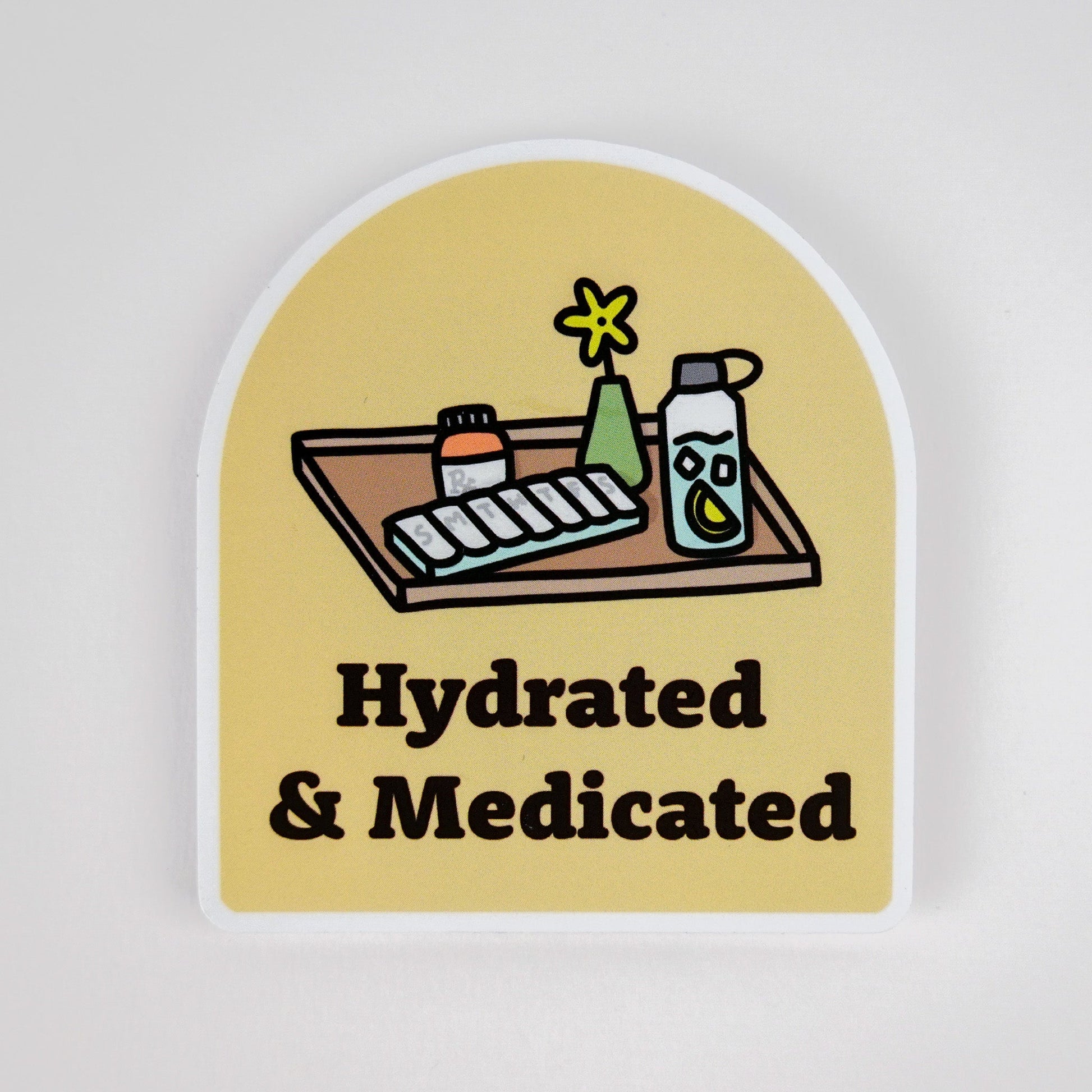 The vibe? Thriving. Hydrated + Medicated is a badge of honor for those prioritizing both fluids and function. This 2.75" x 3" vinyl sticker celebrates health routines, tiny triumphs, and the beauty of modern medicine.