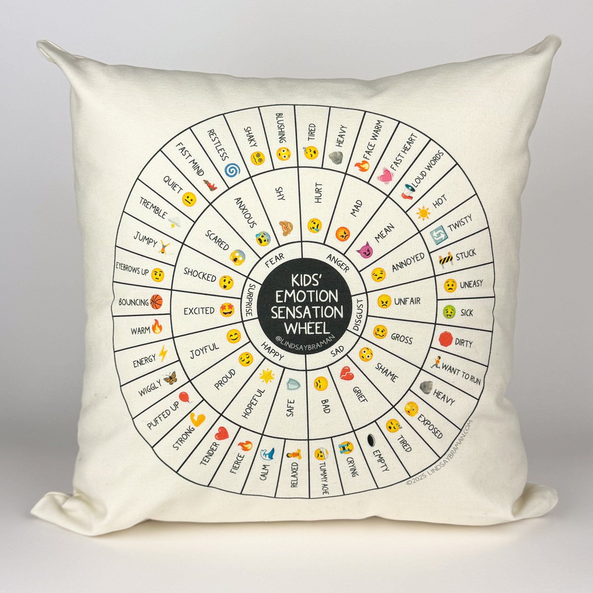 This two-sided pillow comes printed with two versions of the Kids' Emotion Sensation Wheel: the emoji version and the full color version.
