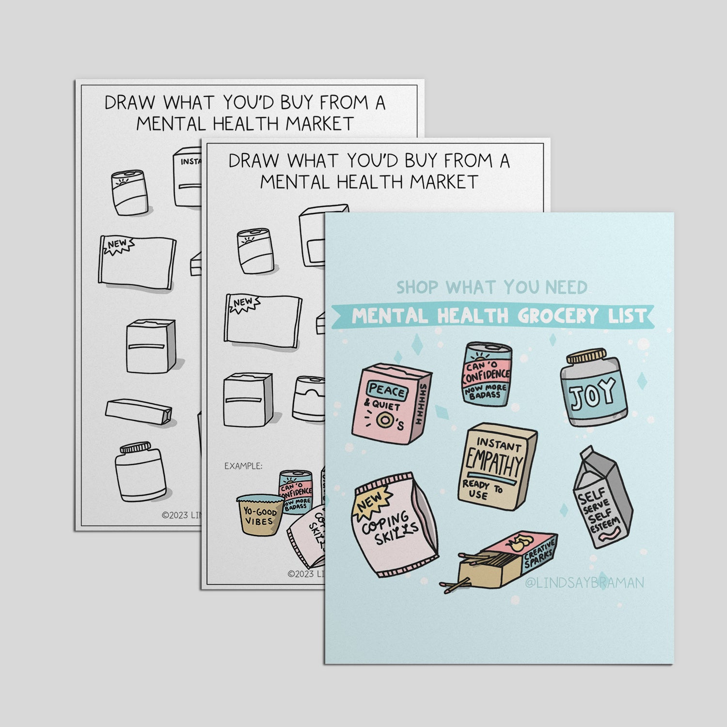 Sometimes, I wish that gaining perspective, coping skills, or empathy was as simple as grocery shopping. I could just order online and let someone else deliver to me! But even though that's not possible, we can dream it. That's why I made these cute little grocery-inspired mental health illustrations. When we remember that things like self-care, confidence, boundaries, empathy, and creativity are as essential to our well-being as a stocked pantry, it may be easier to get a fun little reminder that we all deserve a little more generosity when it comes to getting our needs met.