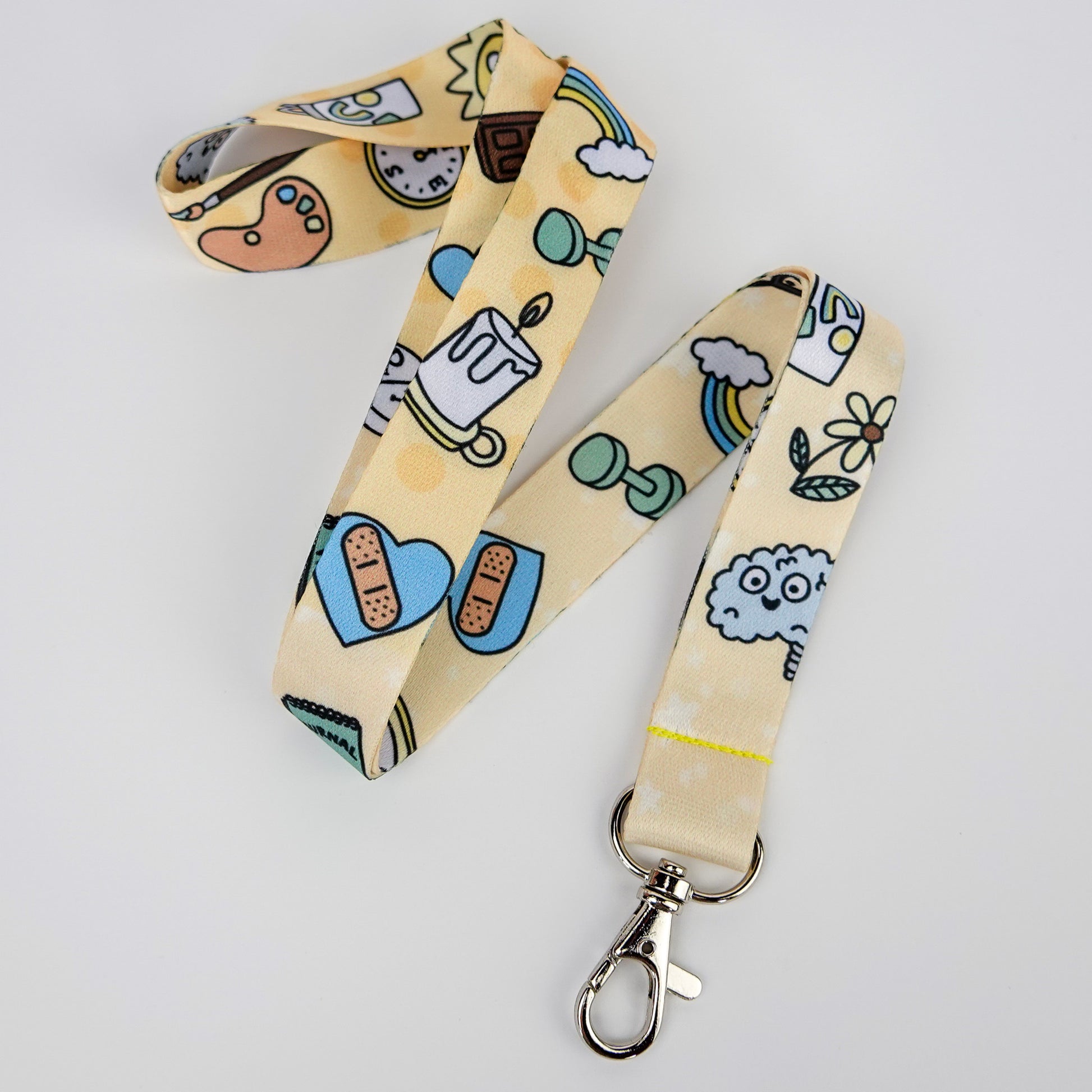 Each lanyard features a repeating pattern of illustrated symbols reflecting the many ways we care for our minds and bodies: