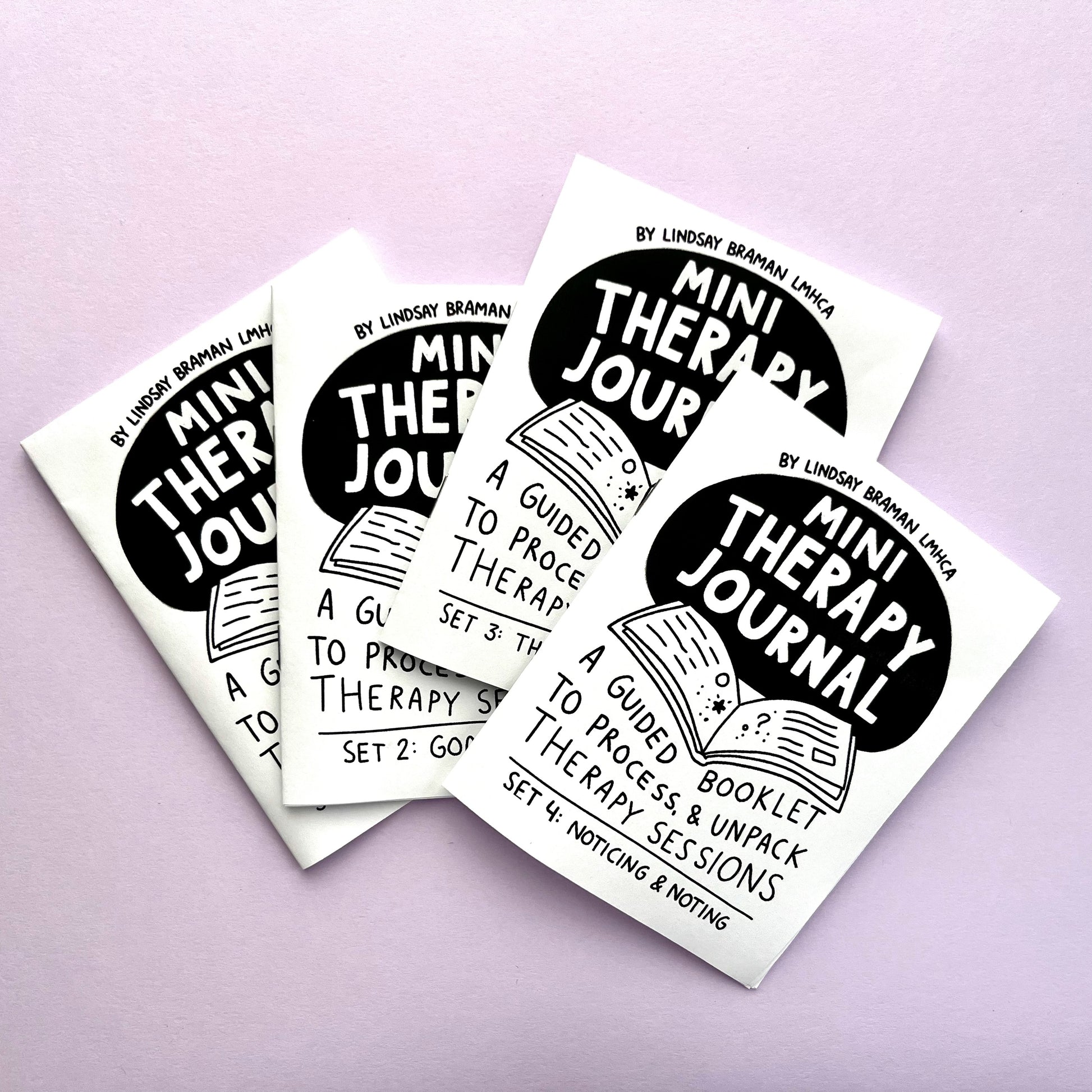 The Mini-Therapy Journal Set includes four print-and-fold downloads featuring prompts from my Therapy Journal. While many people will find the mini-journal set helpful, I developed it with practitioners in mind. This bundle of resources is great to have on hand for clients who would benefit from guided prompts for processing and containing therapy sessions.
