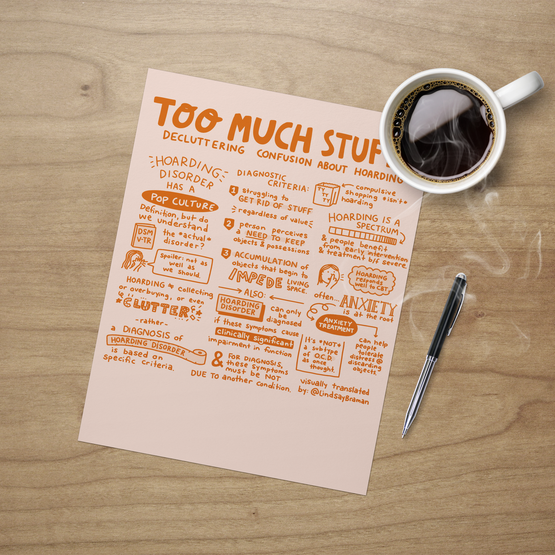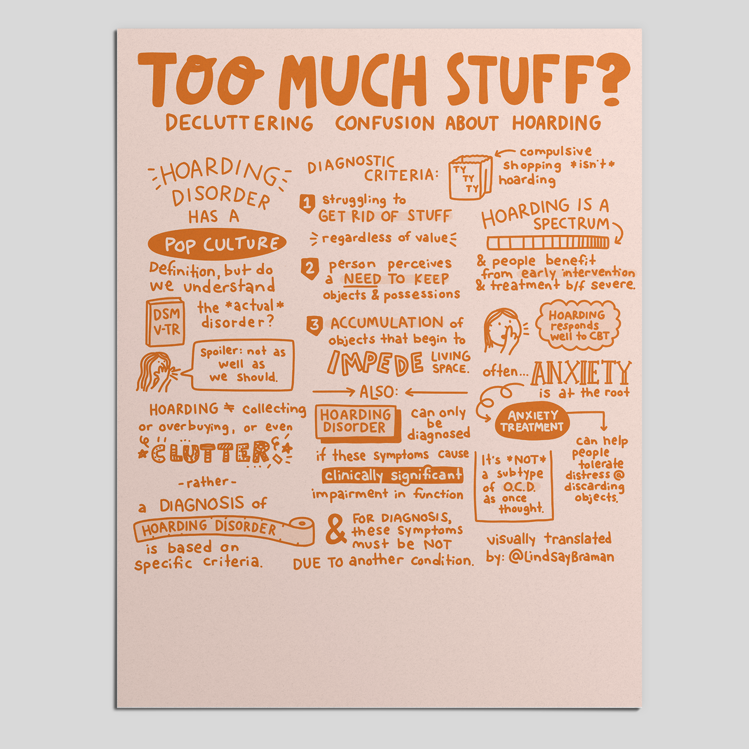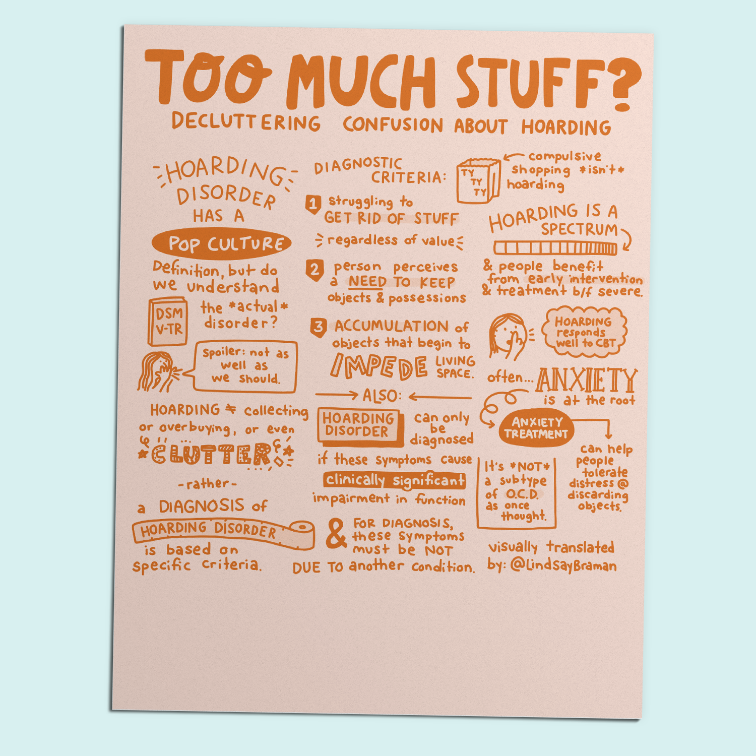 We’ve all held onto something “just in case” - a box, a broken gadget, an old magazine. But when does saving stuff become something more? This illustrated sketchnote explores hoarding disorder, what sets it apart from everyday clutter, and why it’s more than just a tidying issue. Using current diagnostic criteria, it explains how difficulty discarding items, a strong need to keep things, and clutter that impedes living space can signal something deeper. It also highlights the role of anxiety, why hoarding exists on a spectrum, and how treatment like CBT can help. Whether you’re a mental health professional, a student, or just curious, this printable PDF offers a thoughtful, visual overview of a misunderstood condition.