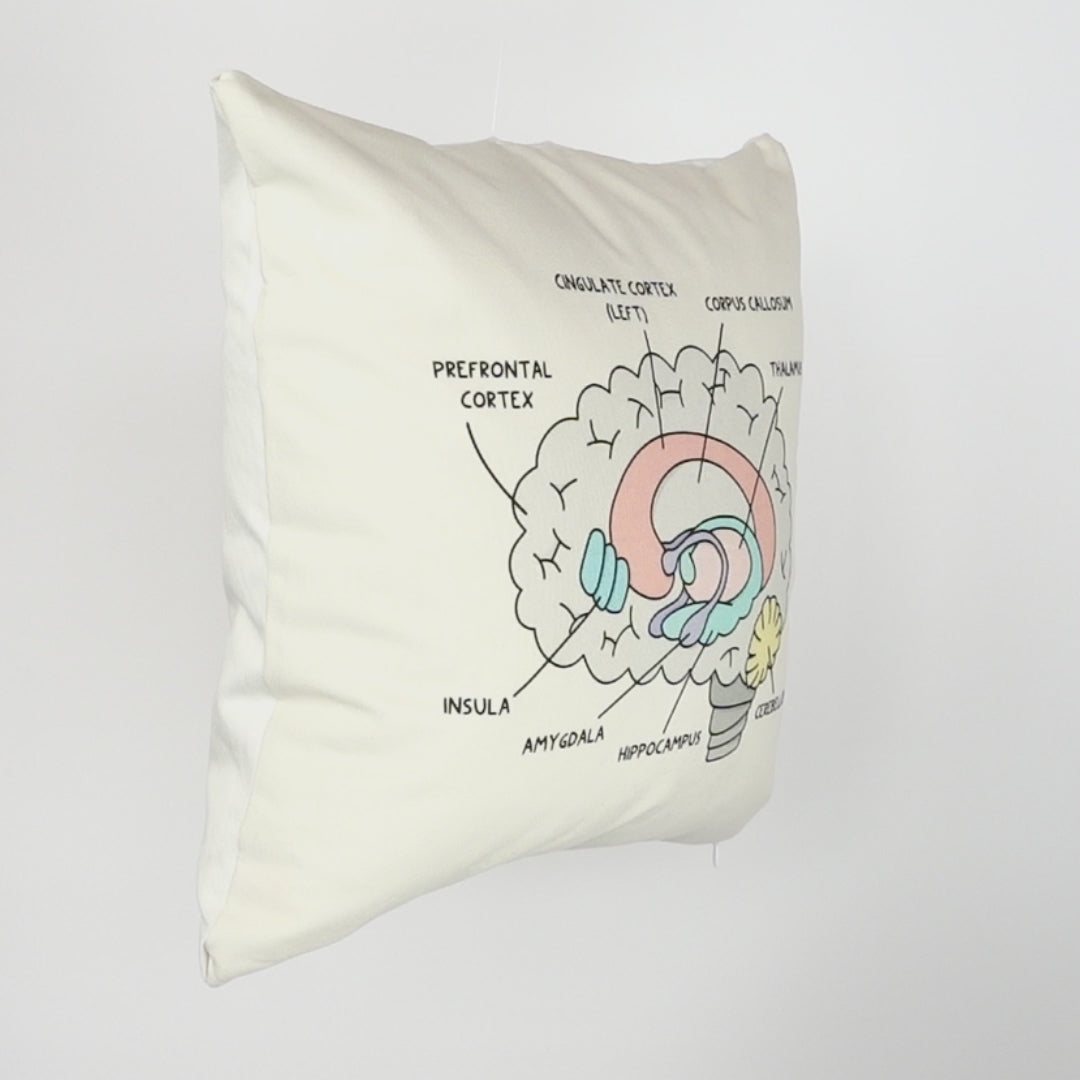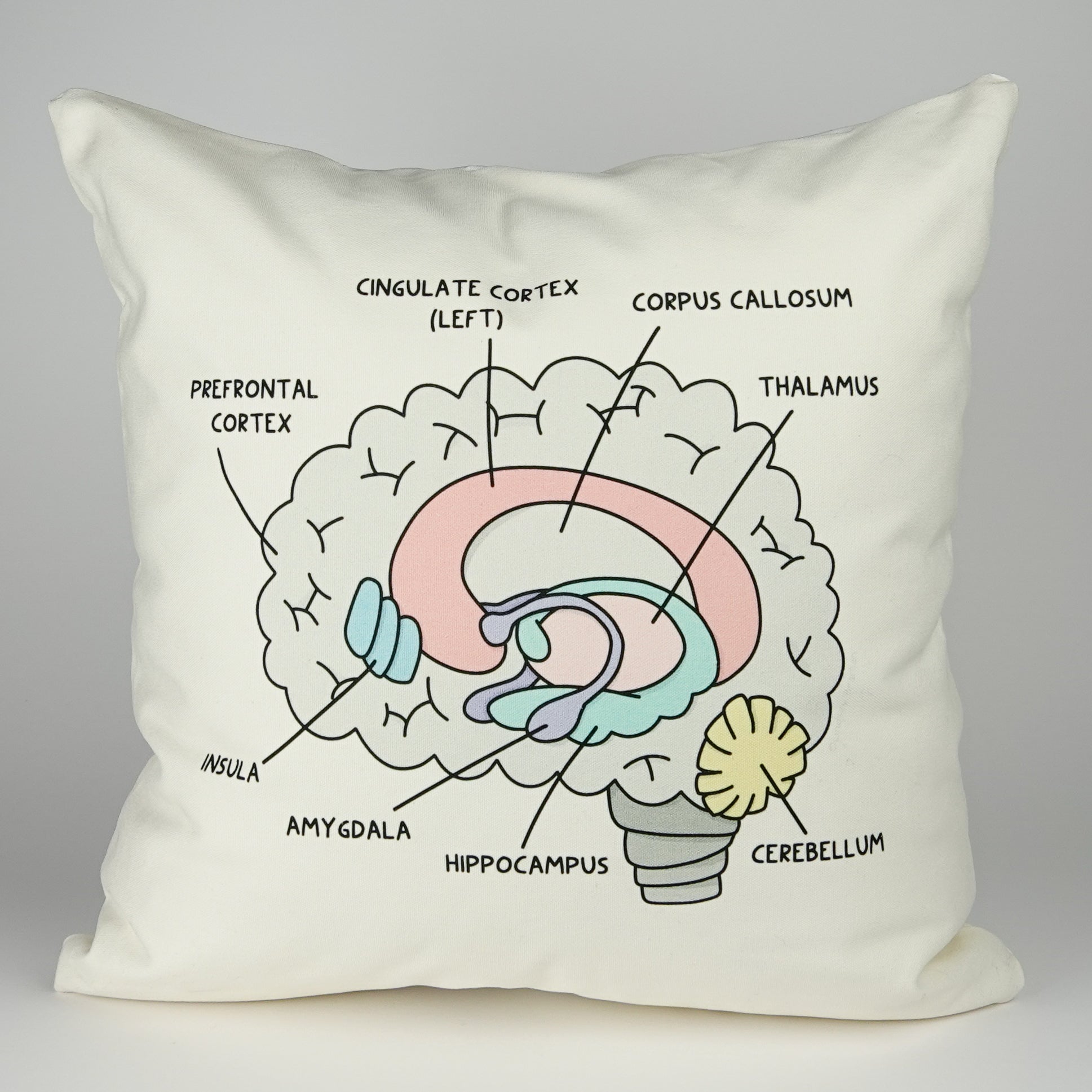 This simple brain anatomy throw pillowcase is designed to be an easily approachable visual teaching aid for all ages. By emphasizing basic geography over anatomical correctness, this interactive resource can help kids, teens, and adults learn to identify parts of the brain.