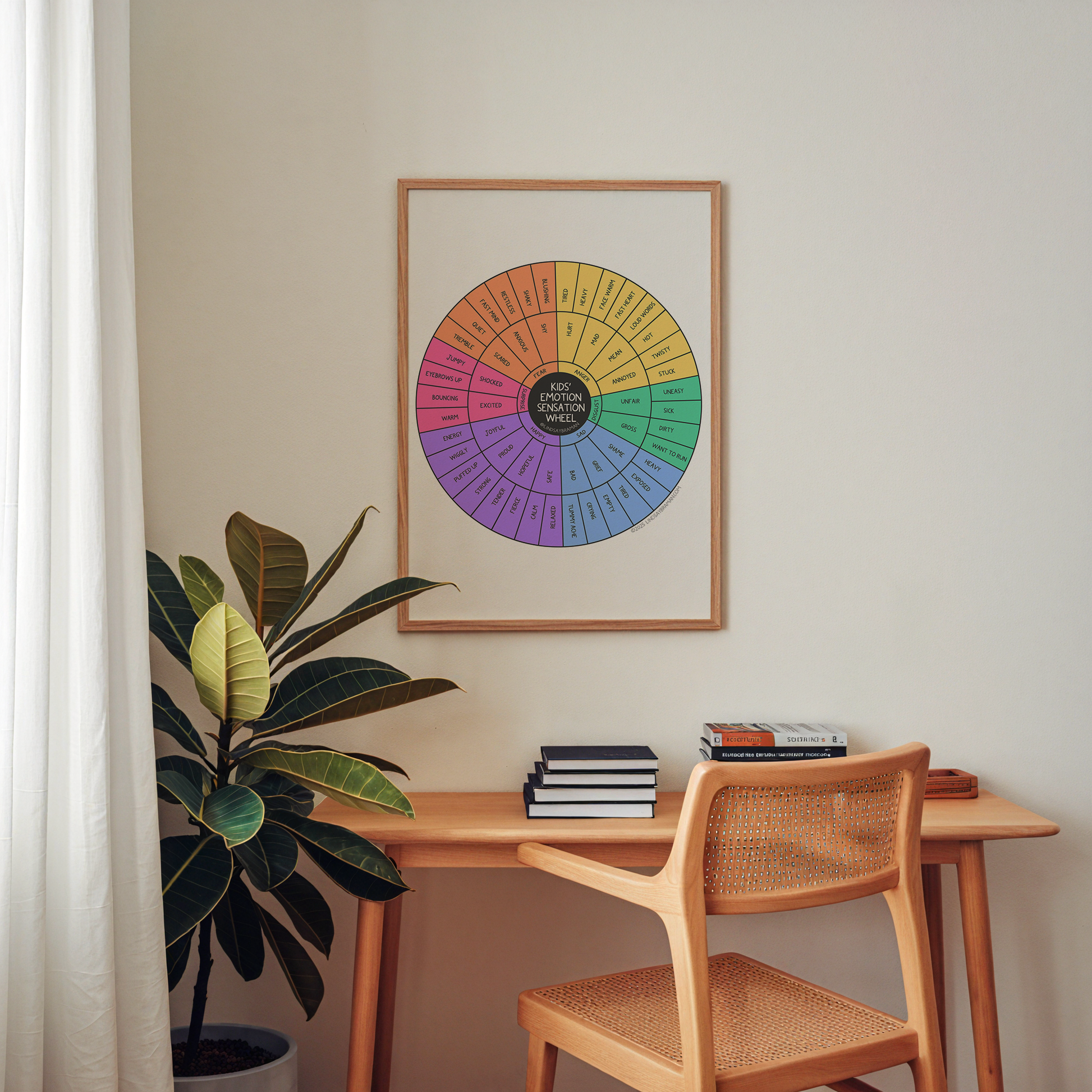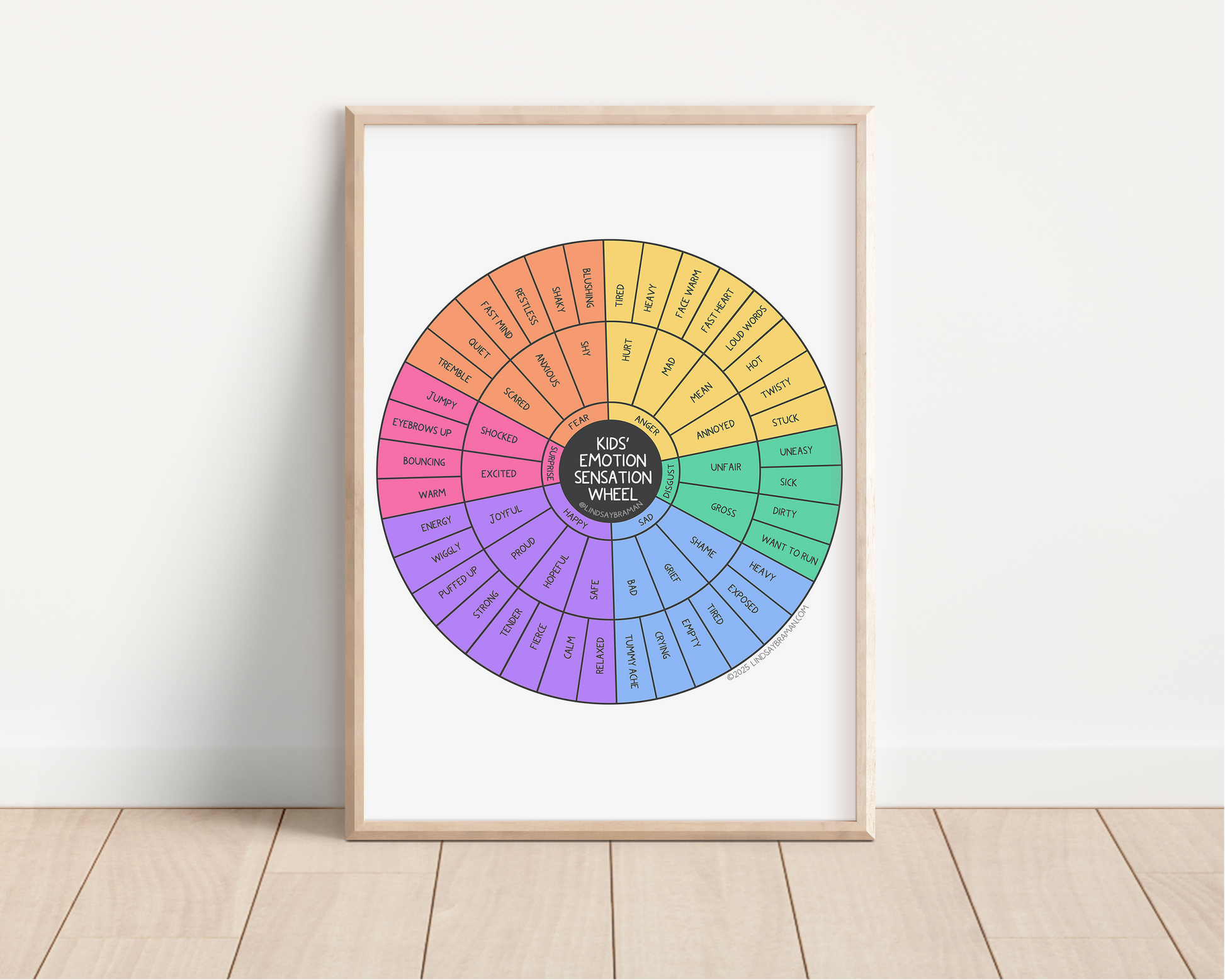 About this Artwork: The Kids’ Emotion Sensation Wheel helps children connect body sensations with emotions, building emotional awareness in a developmentally appropriate way. Designed with input from parents, educators, and therapists, this tool uses kid-friendly language (like “twisty” instead of “writhing”) and comes in a bright, playful color.