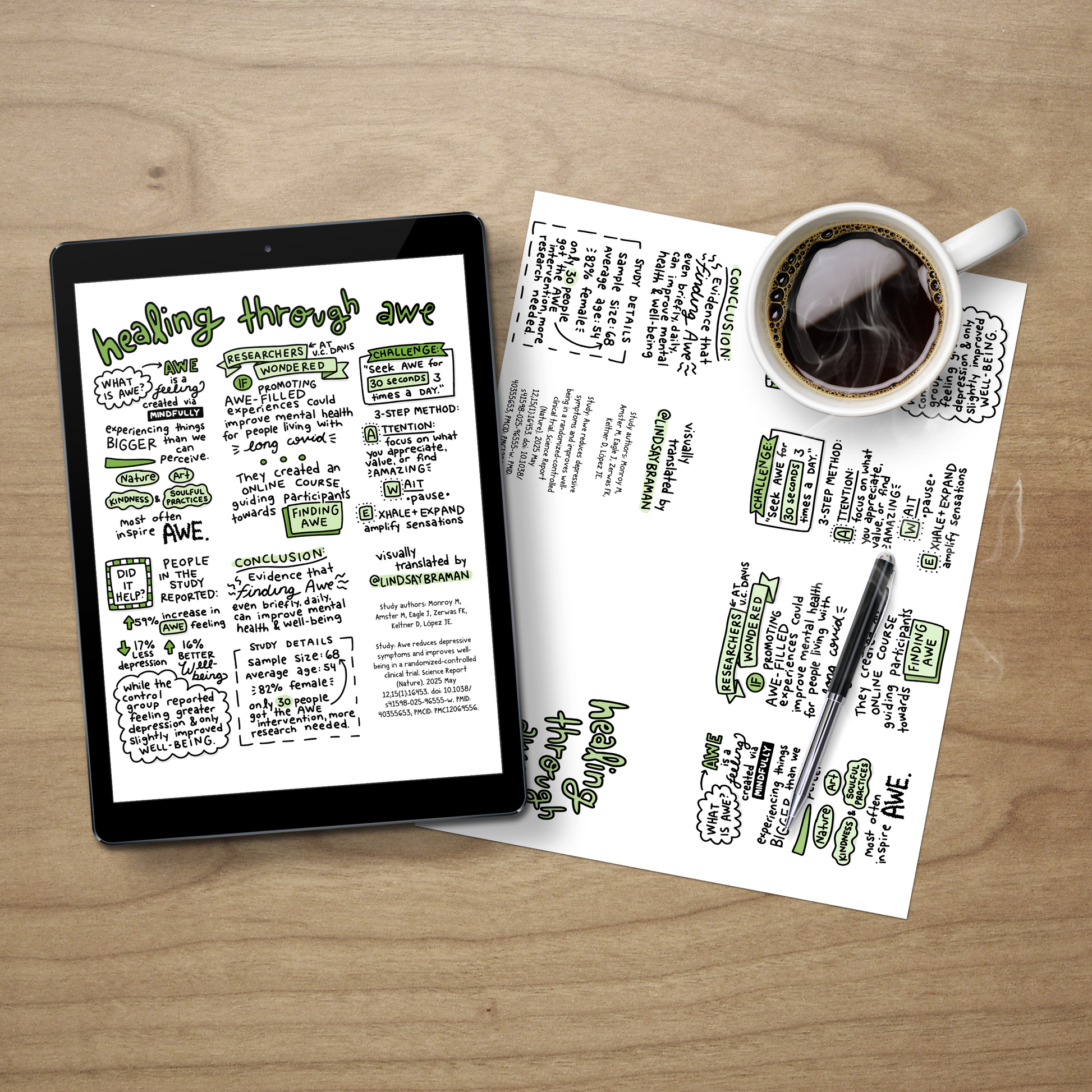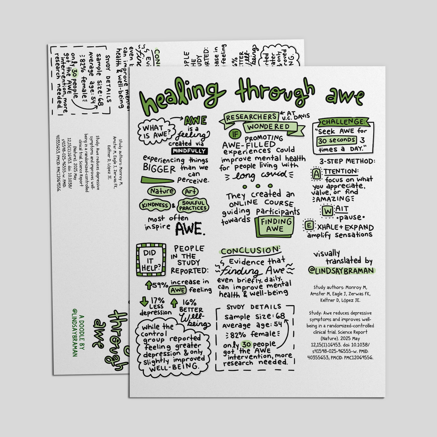 The results of a small study published in Nature this summer caught my eye, and I made this doodle and zine to help translate the study into a more accessible (and fun!) format. Researchers at María Monroy, Michael Amster, Jake Eagle, Felicia K. Zerwas, Dacher Keltner & Javier E. López explored whether intentionally curating experiences of awe might improve mental health and well-being. It's a good reminder for all of us to take a moment to breathe, get grounded, and notice the magnitude of wonder in the world around us.