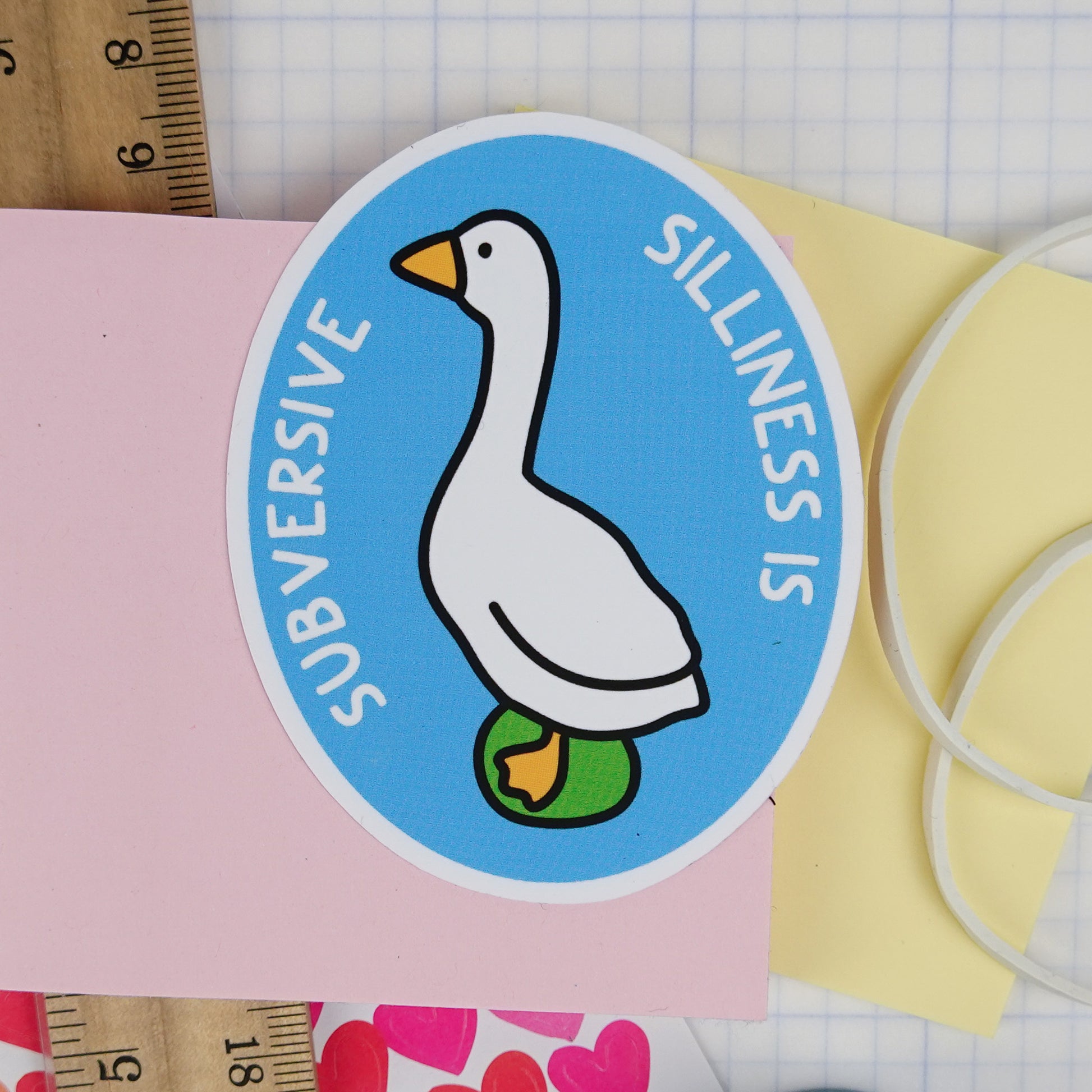 Ok, silly goose, here's what I want to affirm: silliness is subversive. Play is how we survive tough times- and that impulse to just be silly? That's your survival instinct! Defend your right to be silly and spread the good news of PLAY with this sticker affirming all things weird, loud, joyful, and unserious.
