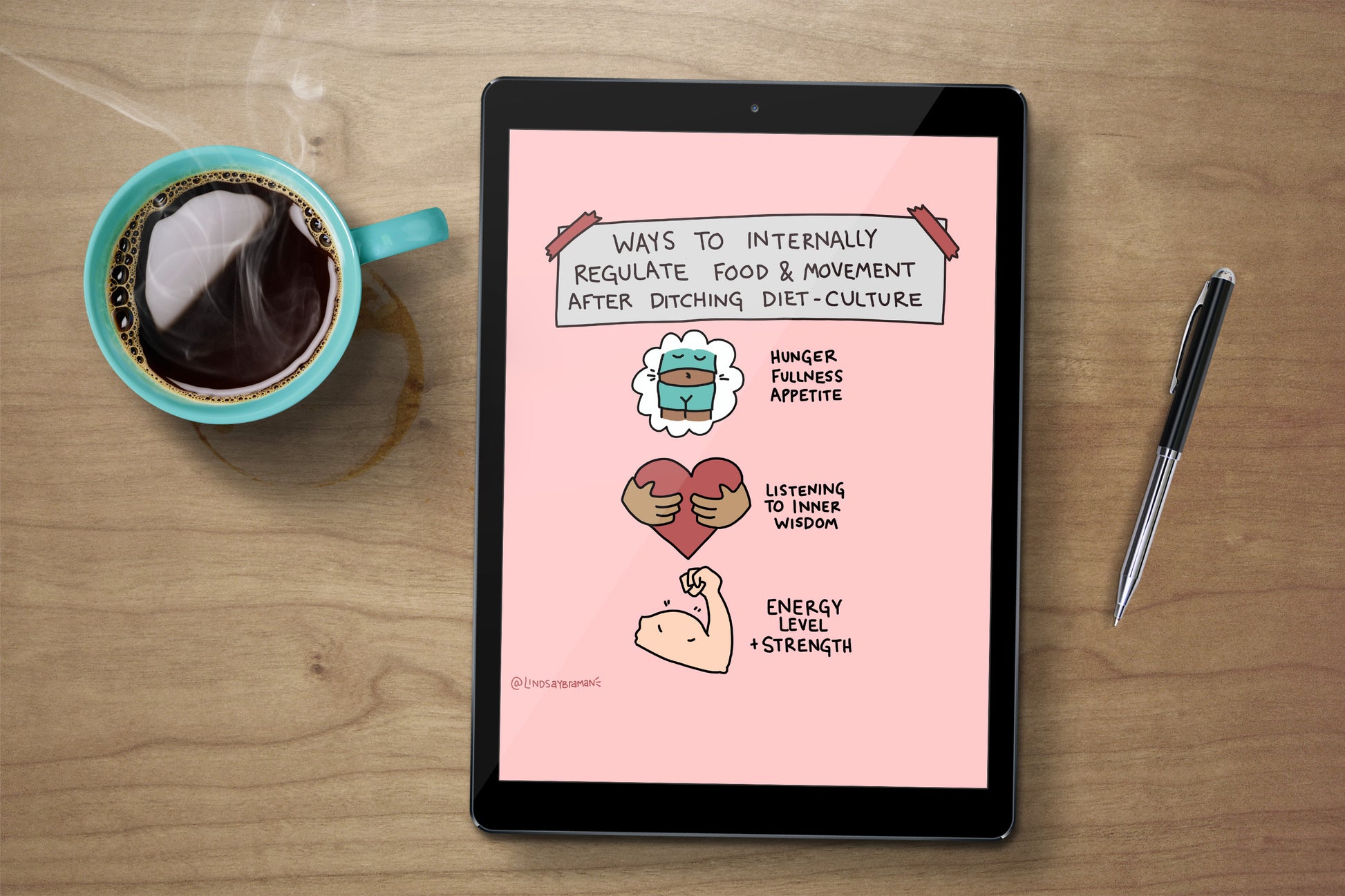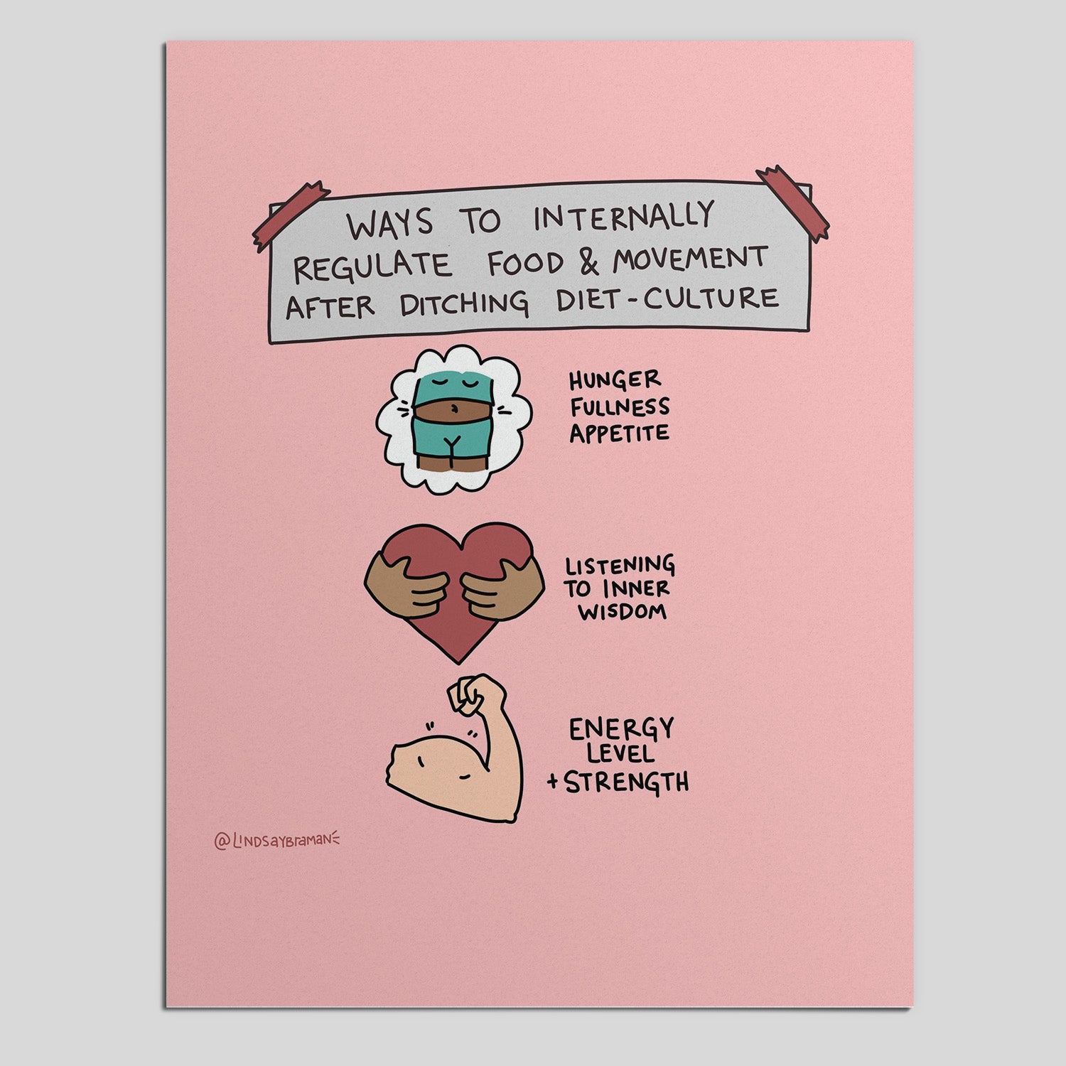 This resource illustrates ways we can learn to listen to internal cues to regulate after ditching diet culture. With intention and attention, we can grow our inner cues into an internal authority that is safe, trustworthy, stable, and kind- everything that diet culture is not.